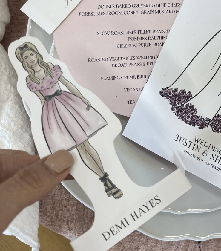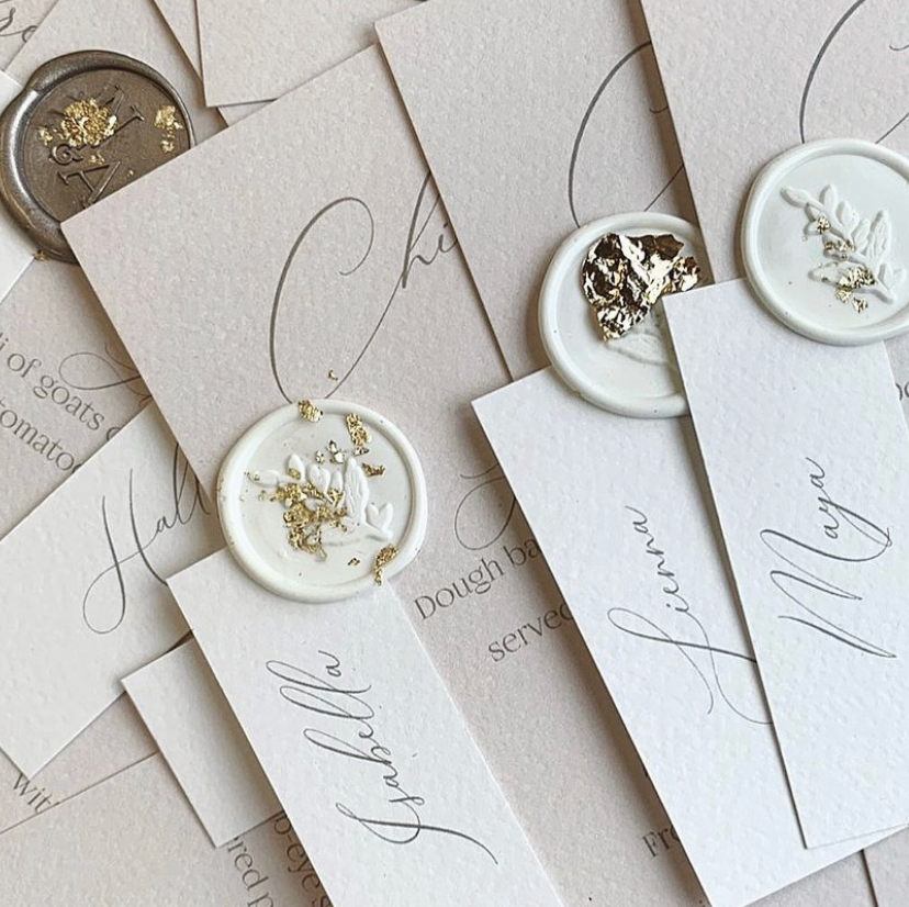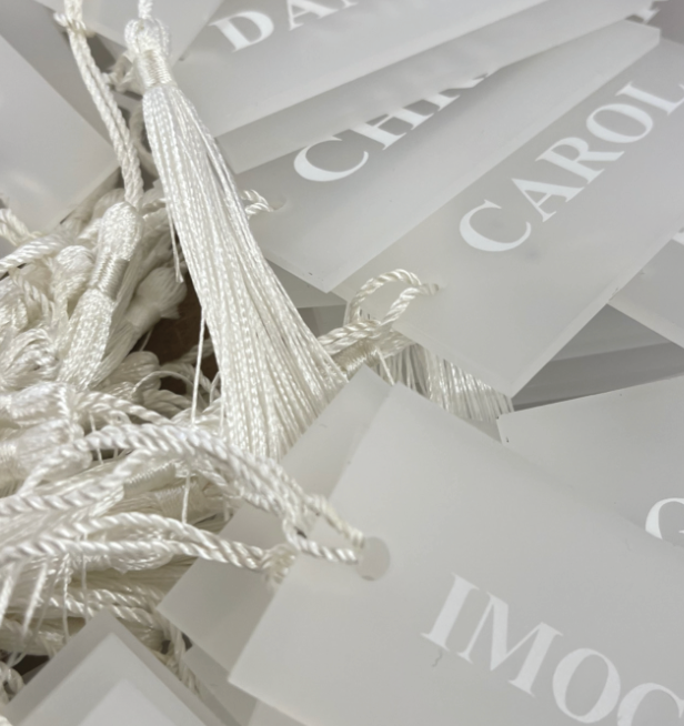 We design and create place name settings bespoke, and tailored to your colour scheme and style by hand at our studio. To book in yours, drop us an email with your requirements. We don't need to know your personalisation details until 8 weeks before your big day!
