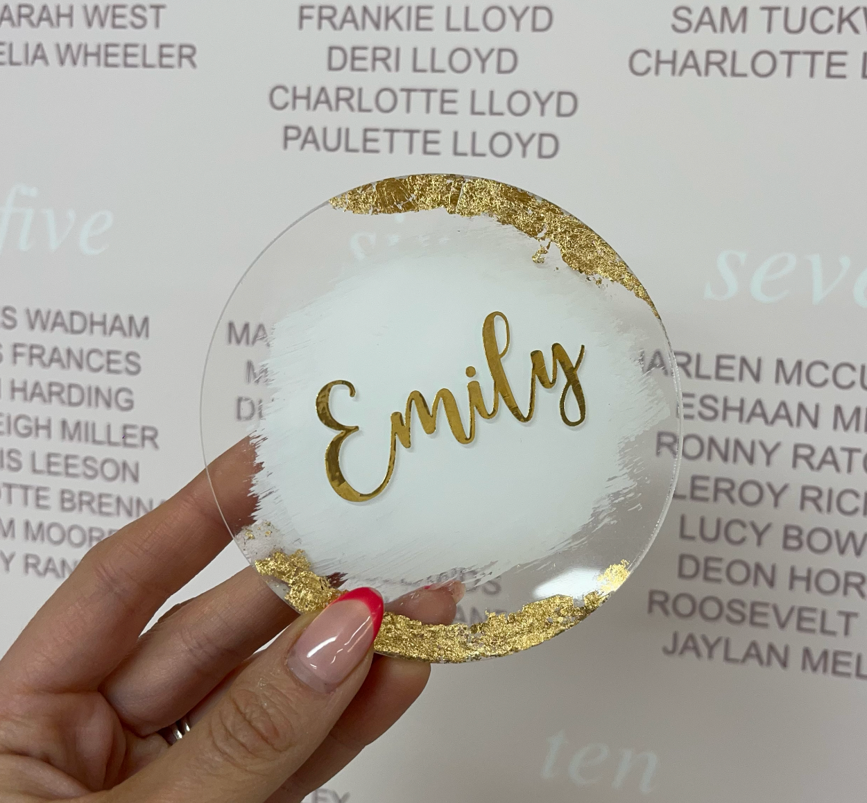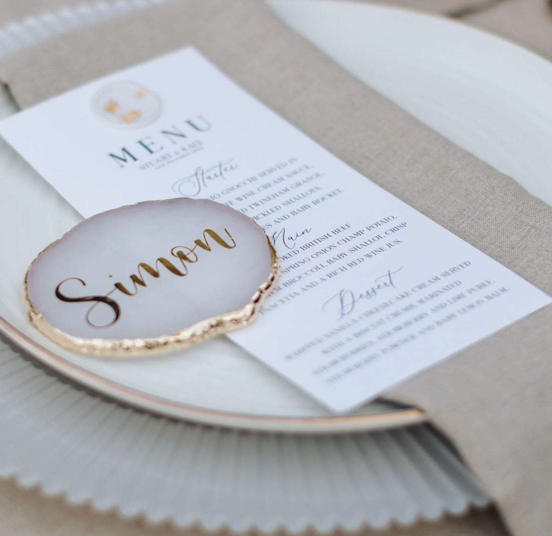 From cardstock, acrylic or resin, our place name settings sit beautifully on each plate. Our acrylic and resin coasters double up as a favour and name setting! Perfect for your guests to take home and enjoy.